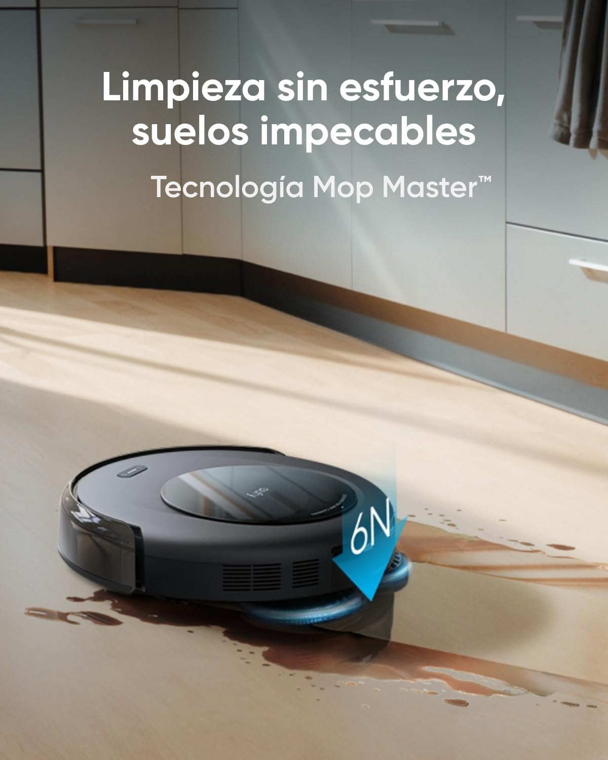 - Aspira y trapea al mismo tiempo: el robot C20 aspira y trapea simultáneamente a través de la aplicación para una limpieza más rápida del piso completo. Mop Master aplica 6N de presión hacia abajo a 180 RPM para eliminar las manchas secas en madera dura, baldosas y laminados. Cuando se detecta la alfombra, el trapeador se levanta automáticamente para mantenerla seca. Para manchas difíciles, Zone Cleaning te permite trapear la misma área dos veces. Nota: Para alfombras de más de 0.787 in / 0.78 pulgadas, establece Zonas No-Go en la aplicación.