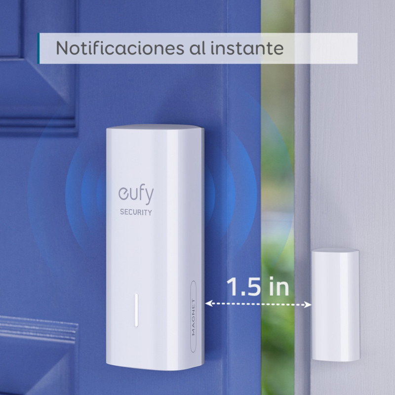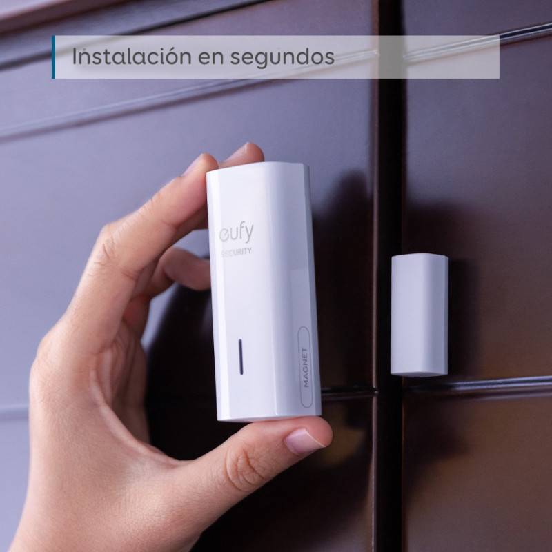 Sensor de puertas y ventanas, de fácil instalación, con 2 años de duración de la bateria, envía notificaciones al instante y activa una potente sirena de 100db. Requiere el set de seguridad Eufy Security kit de cámaras.